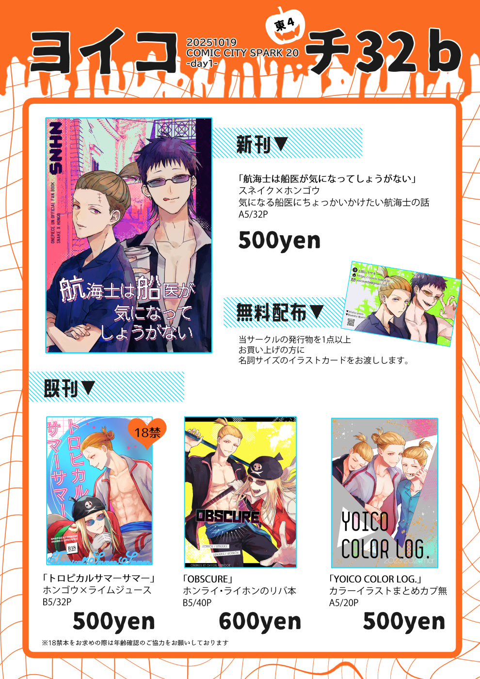 同人誌「航海士は船医が気になってしょうがない」は10/19日発行なので、もうしばらく待っていただけるとフロマージュに入荷されるのでご確認お願いします。